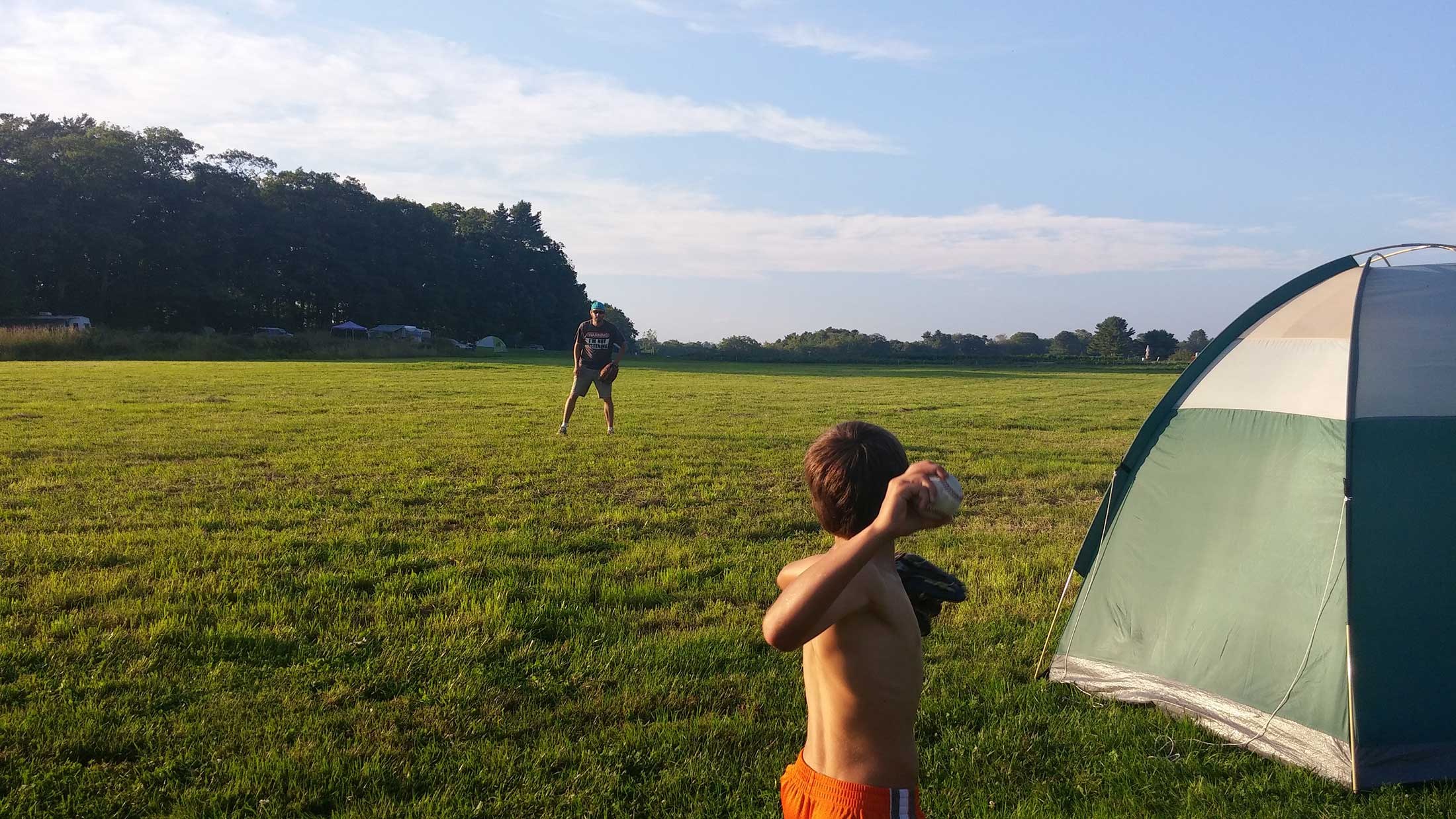 West Bay is perfect for families with small children. This area features our recreation field, playground, and shower building with flushing toilets. Most sites are wide open and grassy, and have panoramic views of Casco Bay and our vegetable fields. RVs are allowed on certain sites. This is an awesome area to enjoy the sun and stars, and to see our farmers hard at work.