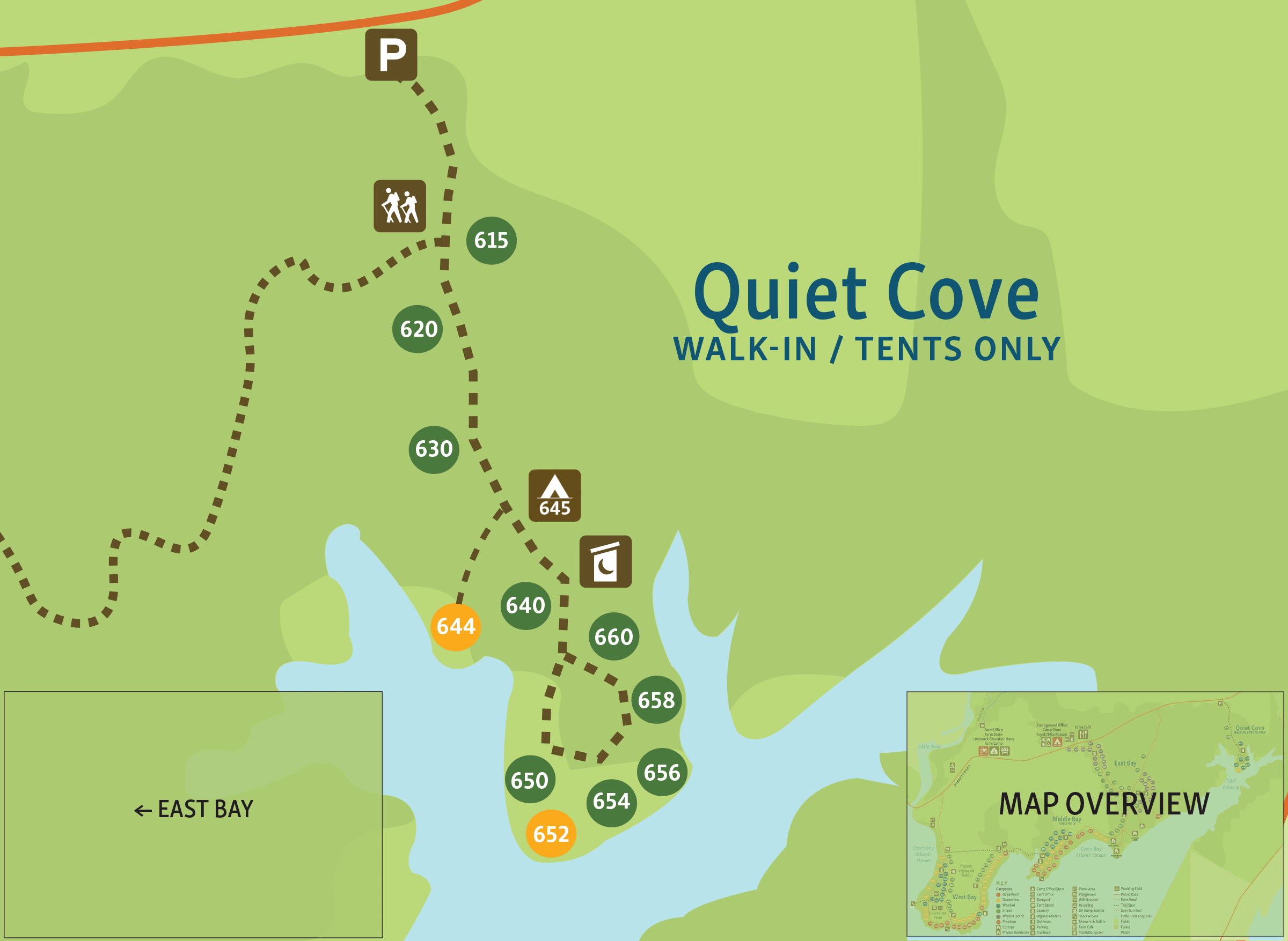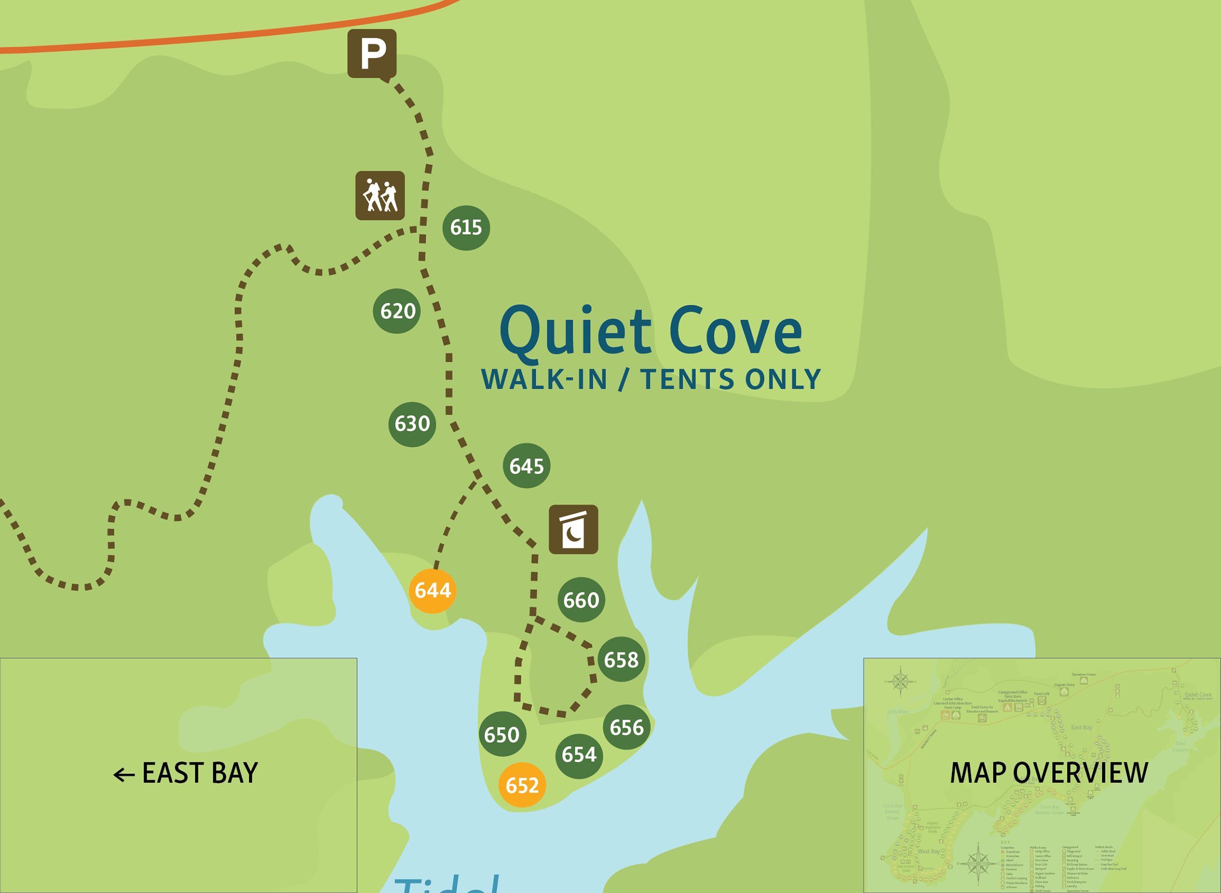 This car-free, walk-in section is perfect for those looking for a back-to-nature camping experience. Set along the edge of a tidal estuary, this area will quickly become a favorite of those looking for quiet and solitude. Birds love this area, too, and it is frequented by osprey, heron and eagles. Campers agree to keep voices low at all times, and refrain from using amplified music or bright lights. Each campsite is hammock-friendly, and is limited to three people and one tent. Garden carts are provided for transporting camping gear. This area can also be reserved for those wishing to hold group retreats.