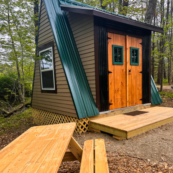 These cozy, 120 square foot A-frame style mini cabins allow guests to unwind and enjoy the beauty of nature. Comfortably accommodating two people, it lands somewhere between tiny house living and cabin camping, crafted from restored barn materials here at Wolfe’s Neck Center.